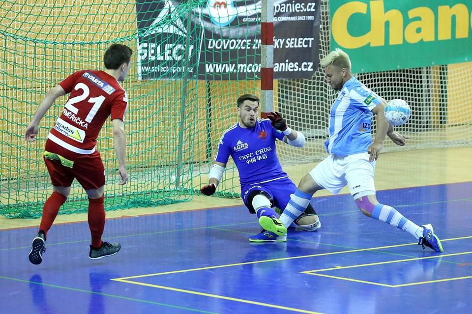 Slávisté otevřeli skóre také třetího utkání, když se po přihrávce od Petra Olivy před brankou nadvakrát prosadil Michal Salák. Plzeň ale dokázala snížit, sice ne ze hry, ale z penalty, kterou nařídili rozhodčí za zákrok Martina Brychty na Tomáše Abrahama a proměnil ji domácí exekutor těchto kopů Michal Štrajt. Slávisté si vypracovali několik dalších nadějných šancí, ale vedení na svoji stranu nestrhli. Tu největší měl v samotném závěru poločasu Radim Záruba, který netrefil odkrytou branku. Největší plzeňskou šanci zmařil obětavým skluzem Martin Směřička. Po přestávce začali lépe hosté, Abraham zachytil slávistickou rozehrávku a zakončil krásnou technickou střelou do horního rohu branky. O pět minut později bylo vyrovnáno, když akrobatickým způsobem svými zády prodloužil do sítě volej Antonína Hrdiny Ondřej Míča. Interobal pak získal výhodu přesilové hry, když Ondřej Míča dostal červenou kartu zákrok, kterým hasil Směřičkovo podklouznutí. Tomáš Štverák nakonec míč protlačil za Vahalova záda. Slávisté ale dokázali znovu vyrovnat - Michal Salák krásně uvolnil na pravé straně Petra Olivu, který v pádu vstřelil třetí slávistický gól. Poslední slovo ale patřilo domácím - nejprve Jiří Novotný srazil do vlastní sítě nešťastně Havlovu ránu z levé strany a pak v závěru při power play Marko Hudaček definitivně rozhodl. Slávisté ale měli i v této závěrečné fázi dobré šance - Jan Lištván nastřelil dělovkou tyčku a Michal Salák nepropálil výborně chytajícího Václava Kubíčka z několik metrů, když k němu odskočila rozehrávka domácích. Boj o postup je tedy stále otevřený, další šanci rozhodnout budou mít svěřenci Martina Brychty v pátek v Edenu! Hodnocení trenéra Martina Brychty: Prohráli jsme, hodnotí se mi to špatně. Rozhodl náš vlažnější přistup a nasazení na začátku utkání. Začali jsme kombinovat tak, jak máme asi až za stavu 1:2. Soupeři jsme navíc nabízeli situace, ze kterých mohl vstřelit laciné branky. Nebyla to jenom chyba před červenou kartou, takových situací, kterými jsme Plzni pomohli na koně, bylo dnes bohužel víc. Petr Kučera (Interobal Plzeň): Jsem velmi spokojený s výsledkem, ne už tolik s předvedenou hrou, ale to není v této fázi sezóny duležité. Důležité je, že jsme vyhráli, konečně se dostali do obrany soupeře a zvýšeným důrazem chceme překlopit sérii na naší stranu. Interobal Plzeň - SK Slavia Praha 5:3 (1:1) (stav série 1:2) Branky: 6. Štrajt (pen.), 22. Abrham, 31. Štverák, 37. Havel, 39. Hudáček – 12. Salák (Oliva), 26. Míča (Hrdina), 35. Oliva (Salák) Interobal: Kubíček (Němec) – Mižár, Holý, Štrajt, Havel, Abrham, Kasýk, Hudaček, Šíša, Štverák, Stejskal, Forman, Němec. Slavia: Vahala (Garčár) – Wojnar, Brychta, Záruba, Novotný, Salák, Lištván, Oliva, Směřička, Homola, Míča, Hrdina, Matějka. ŽK: Forman, Šíša, Havel - Salák ČK: Míča Rozhodčí: Černý, Kaštánek ![]() |