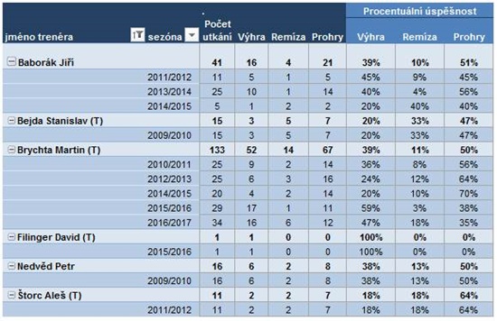 ![]() Jak jsme již informovali, v klubu na vlastní žádost skončil trenér Martin Brychta. V desetileté ligové historii klubu nebyl samozřejmě jediným trenérem, který u A mužstva působil. Přibližně stejné období vedl náš první tým Jiří Baborák, dlouholetý spolupracovník Martina Brychty u reprezentace do 21 let. Především tito dva trenéři se střídali na pozici hlavního trenéra, role dalších byla již spíše epizodní. Ve statistice Oldřicha Pánka uvádíme jejich přehled (u Jiřího Baboráka nejsou započteny dvě sezóny, kdy klub vedl ještě pod názvem SELP):
